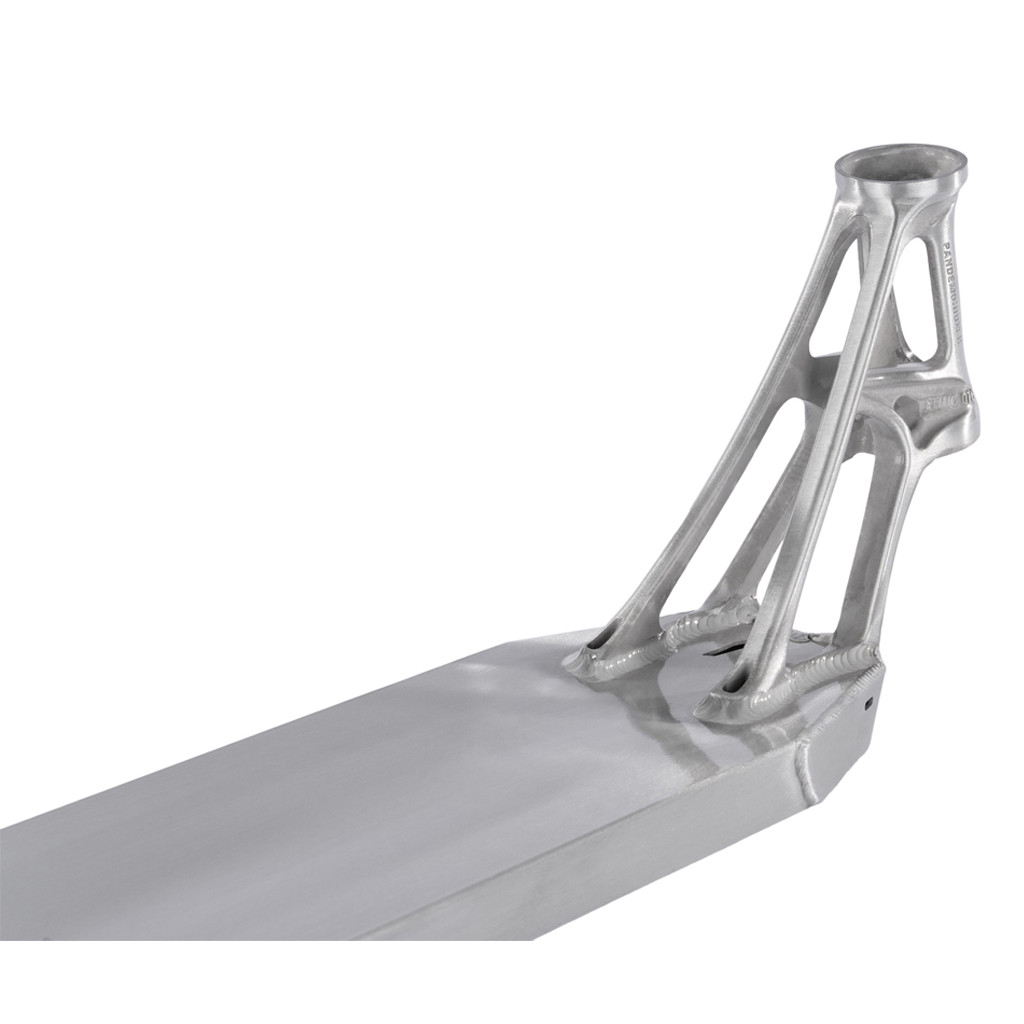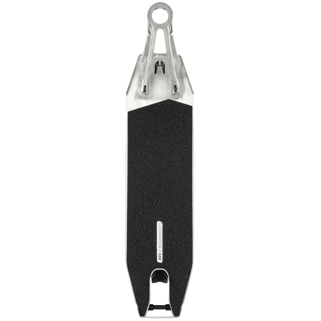 The Ethic DTC Pandemonium V2 deck is a groundbreaking innovation in the scooter world, being introduced as the lightest deck on the market, weighing in at under one kilogram. This deck is the result of meticulous design and hundreds of hours of simulations, all aimed at achieving the lightest and most efficient geometry possible. The V2 version is not only 1 cm wider than its predecessor (130 mm / 5.12"), but it also boasts a 29% improvement in flex resistance and a 40% increase in neck strength.