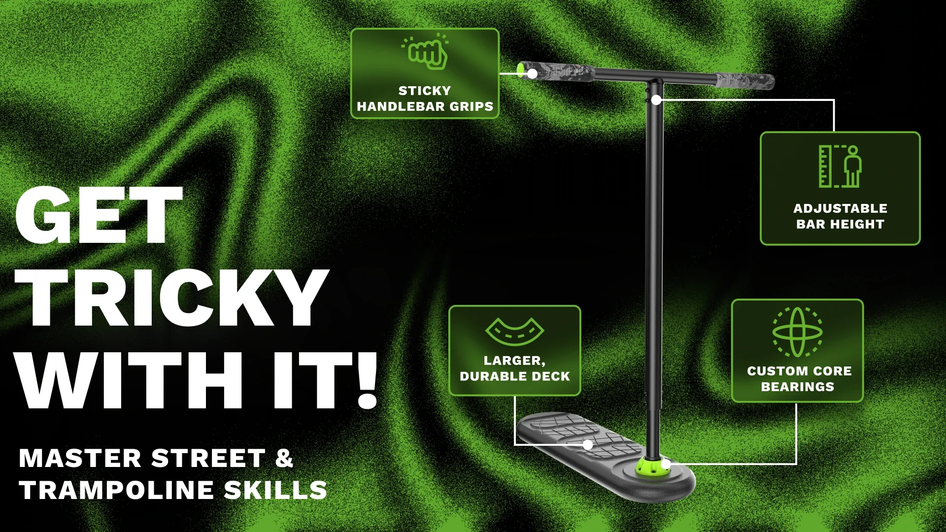 An adjustable handlebar height between 600 mm and 700 mm lets the Fusion adapt perfectly to your body size and riding style. The grippy TPU handgrips offer a secure hold even during fast spins and complex rotations, so you stay confident through every session. The advanced ball-bearing headset ensures ultra-smooth rotation and lightning-quick steering response—exactly what you need for learning or perfecting technical tricks.